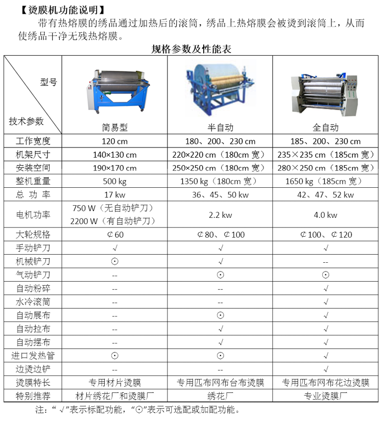 此机器称为“烫膜机”,是专门针对绣花材片除膜的设备。也有人叫它为“脱胶机”、“烫胶机”、“熔膜机”、“熔胶机”、“热熔机”、“滚筒机”、“剥膜机”、“剥胶机”、“剥除机”、“脱膜机”。其工作原理是带有热熔膜的绣品通过加热后的滚筒,绣品上热熔膜会被烫到滚筒上,从而使绣品干净无残留。推荐台布绣材片绣选用此机型,型号参数:工作宽度:120cm;滚筒直径60cm。欢迎来电获取操作视频。